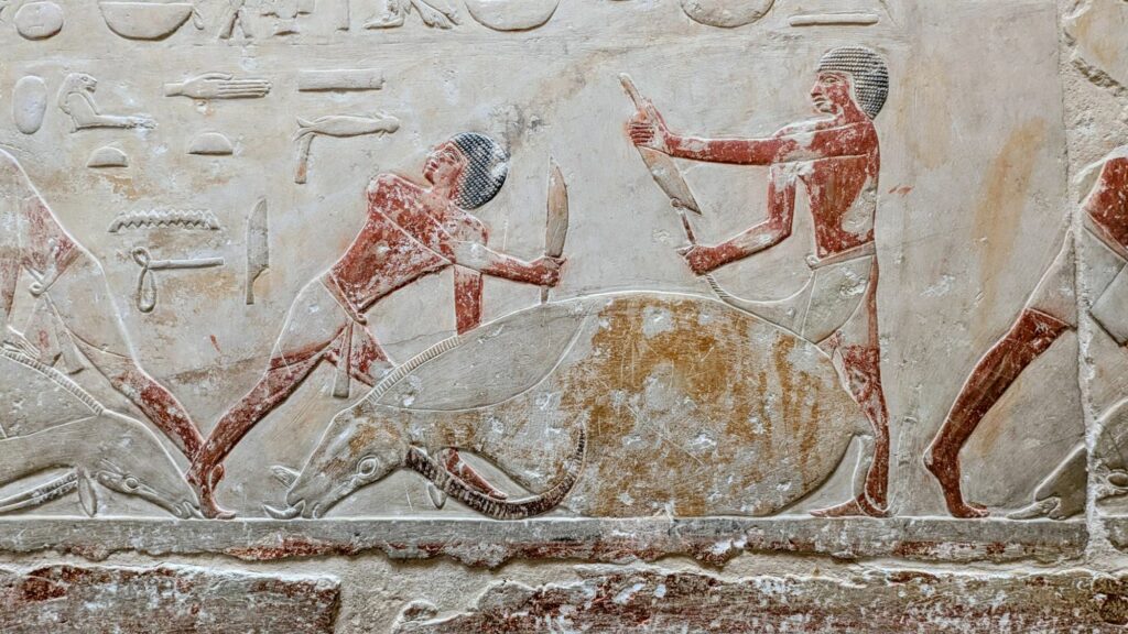 Burial chamber Saqqara pyramidSaqqara funerary templeButchering cowSobek, the crocodile god