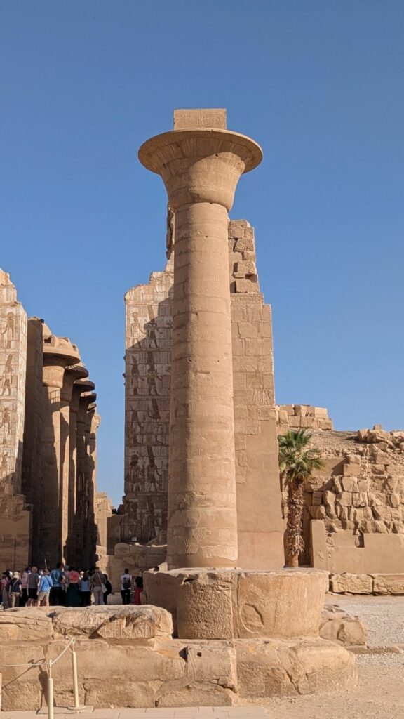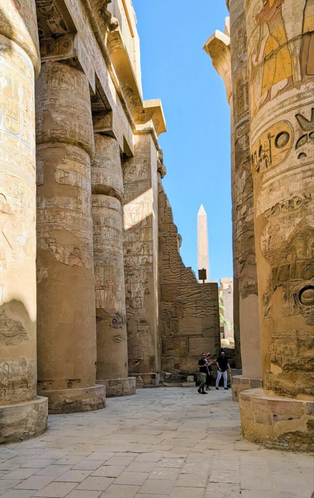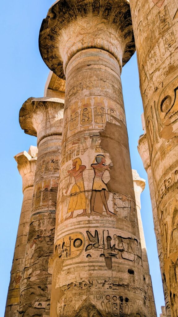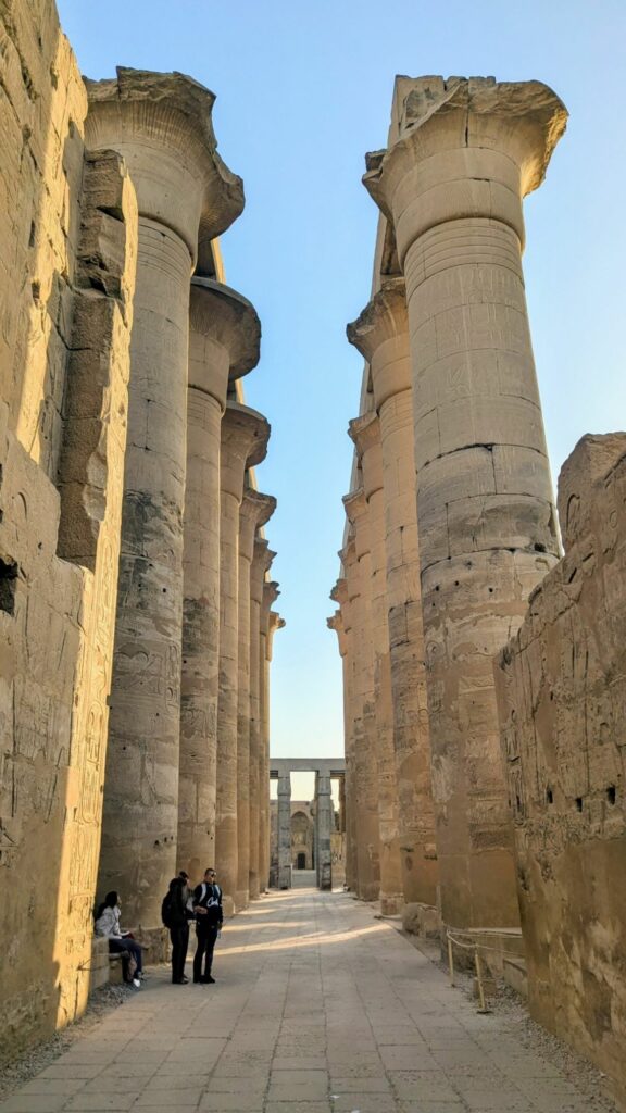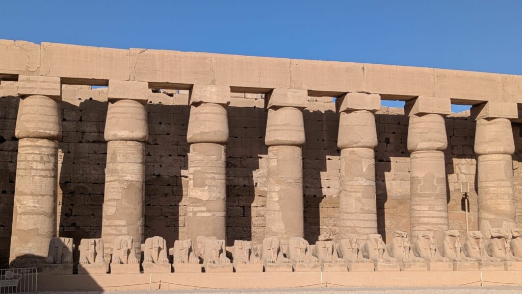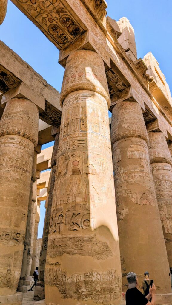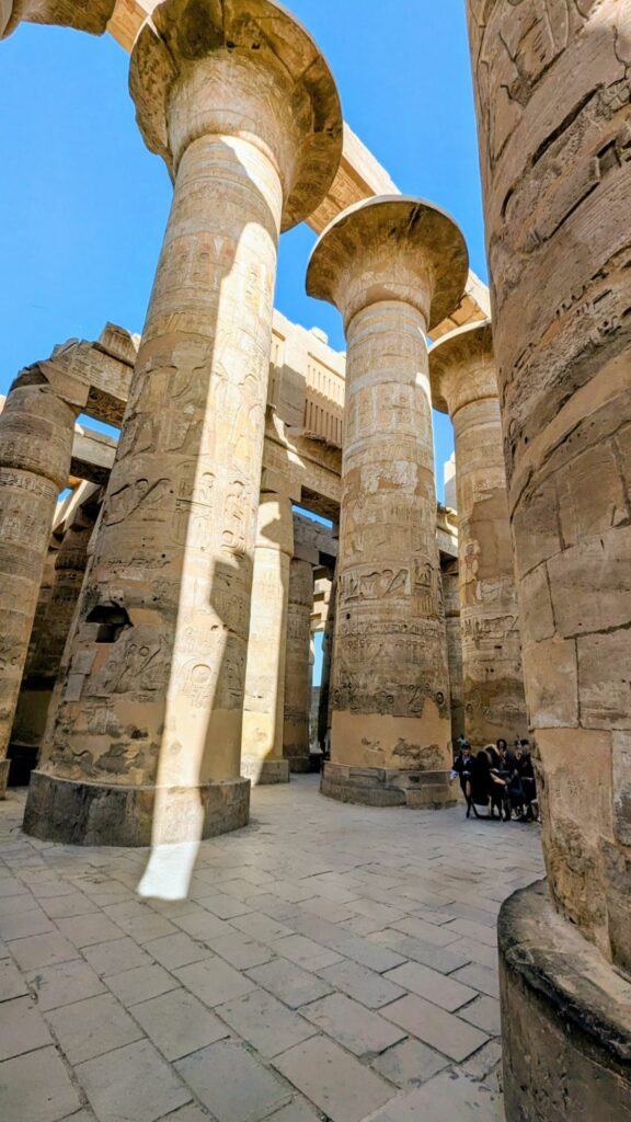 The temple at Karnak, in Luxor, is the second largest in the world after Cambodia’s Angkor Wat. Built between 2055 BC and 100 AD it is dedicated to Amun Ra, the sun god. It was added to by 30 different pharoahs in that time. The centrepiece is the massive hypostyle hall. It is a “forest” of 134 pillars standing 20 metres tall.