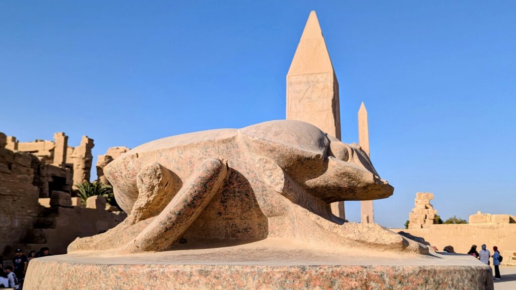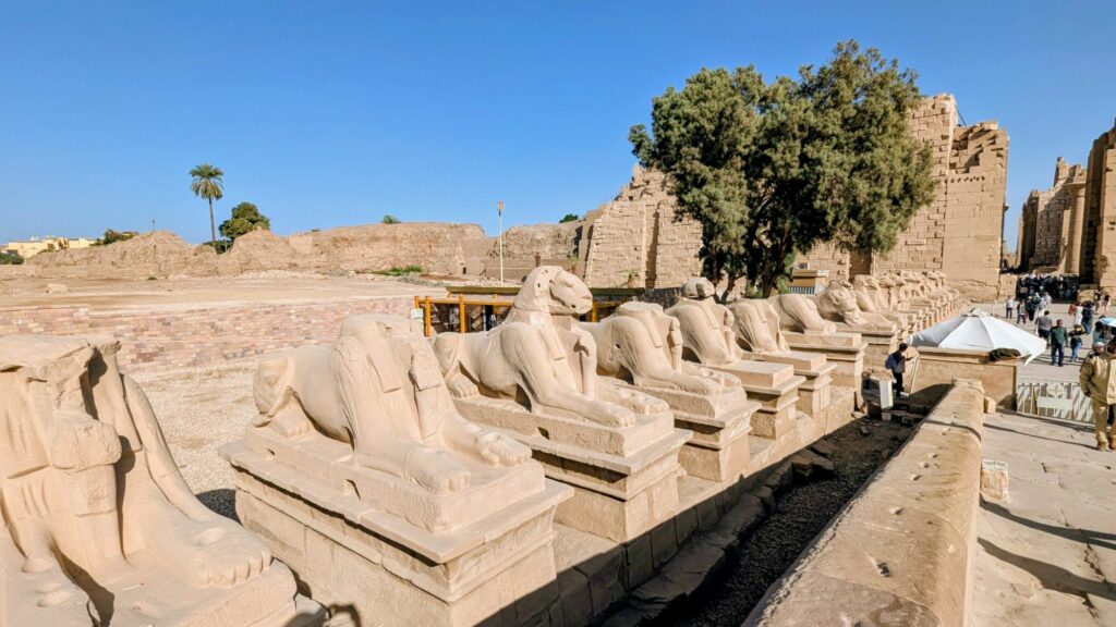 Gates of Karnak and avenue of ram headed sphinxes Hypostyle HallHatshepsut obeliskSacred LakeScarab